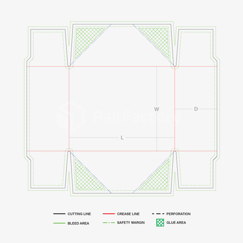 A collapsible tray with four pre-glued corners for added strength and easy assembly. Ideal for food and retail products.